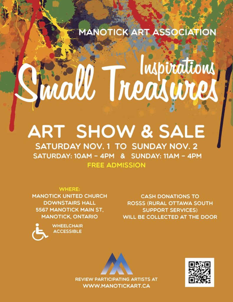 This year’s Inspirations Small Treasures show will be held Saturday November 1st and Sunday November 2nd at the Manotick United Church (Lower Hall). All artist spots have been successfully filled and we look forward to an amazing show with door donations going to ROSSS (Rural Ottawa South Support Services). We are also pleased to report that we will once again be partnering with the Manotick BIA as a passport stop on their Women’s Day Event.